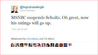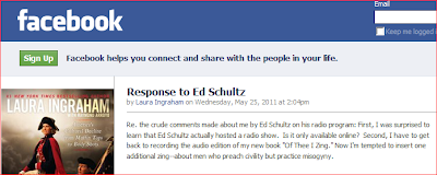 INGRAHAM: "Re. the crude comments made about me by Ed Schultz on his radio program: First, I was surprised to learn that Ed Schultz actually hosted a radio show. Is it only available online? Second, I have to get back to recording the audio edition of my new book "Of Thee I Zing." Now I'm tempted to insert one additional zing--about men who preach civility but practice misogyny"She adds this on twitter: