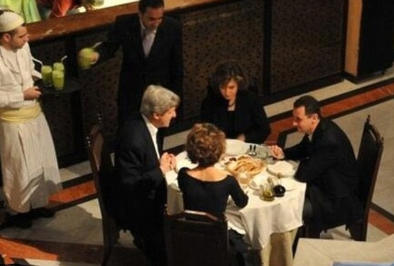 ...But a new photo has surfaced of showing John Kerry and his wife having dinner with Syrian dictator Bashar al-Assad and his wife in 2009 (AFP Photo via dailymail)